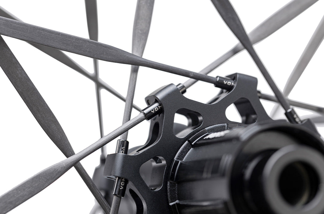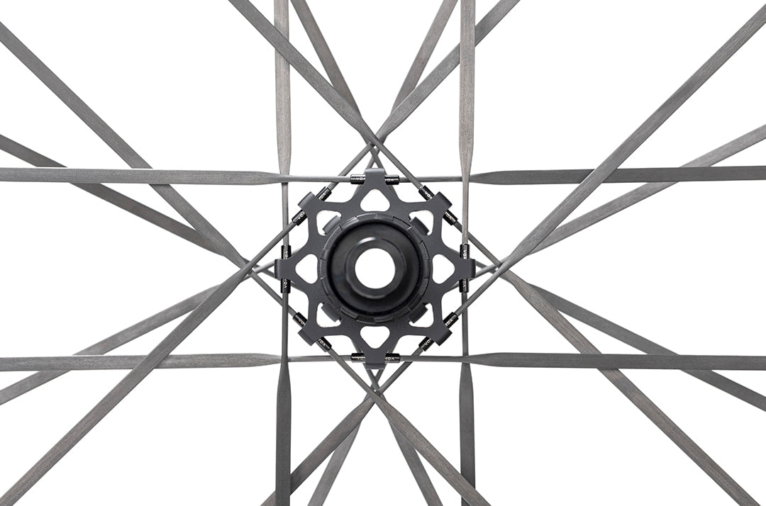 近接180°スポーク引き — ハブへの負担を最小化前輪:168°、後輪:178° の大角度対向引き設計テンションが互いに打ち消し合うことで、ハブフランジへの負荷を大幅軽減日常使用でのハブ摩耗が遅くなり、疲労強度が飛躍的に向上